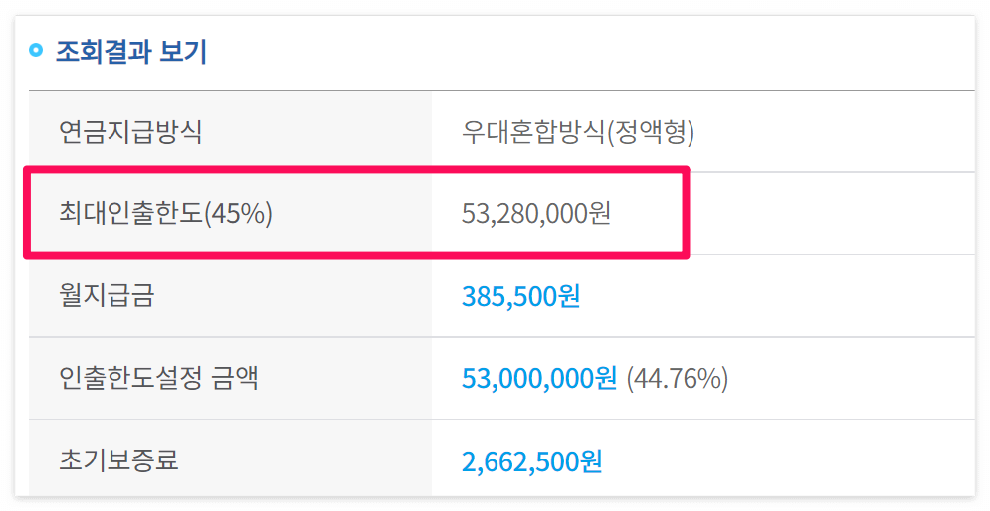 최대인출한도인 5천 3백만원 이내로 인출한도를 설정하여 계산해보니 월 예상수령액이 매달 38만원가량 됩니다.