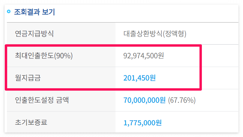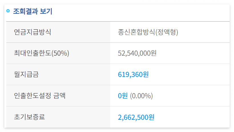 아래와 같이 최대인출한도, 월지급금, 초기보증료를 확인할 수 있습니다. 이것을 확인하기 위해 임의 계산해보는 것입니다.