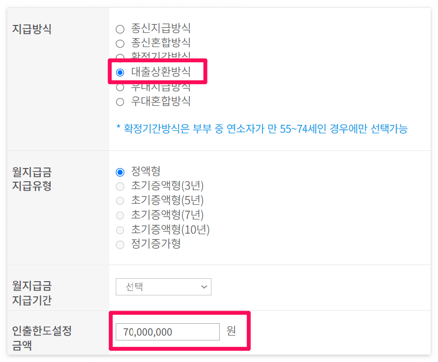 임의로 계산해서 나온 최대인출한도보다 주택담보 대출 상환을 위해 더 큰 금액이 필요하다면 [대출상환방식] 주택연금을 신청할 수 있습니다.