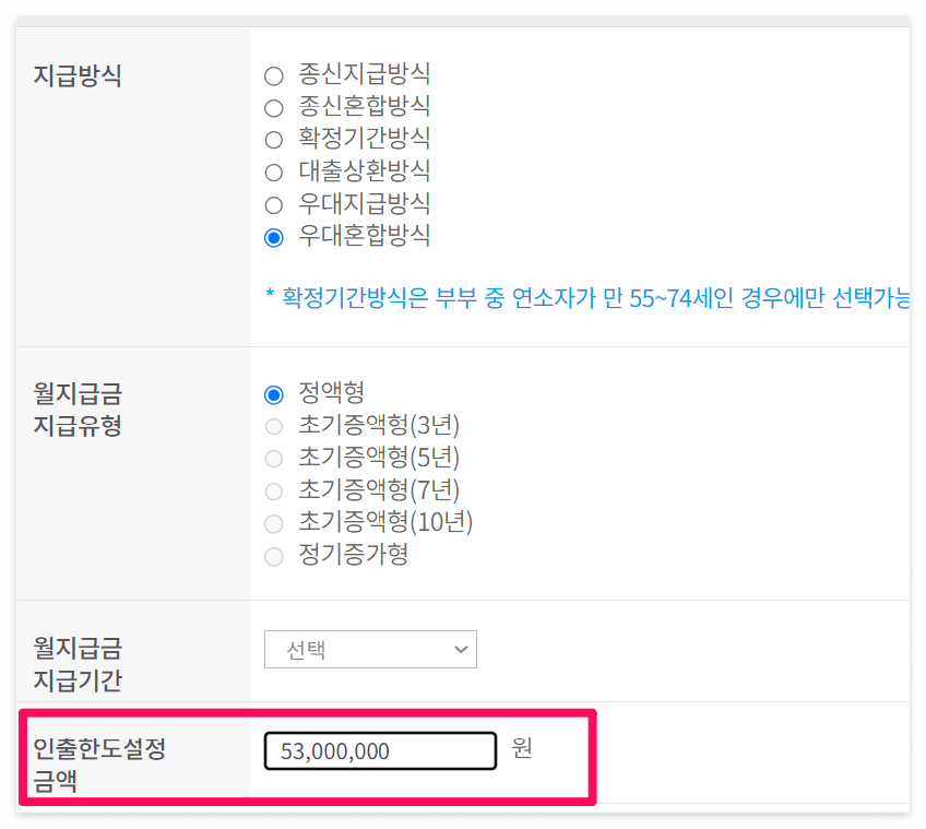 – 주택 가격 2억 5천 초과라면 종신혼합방식, 인출한도 0원